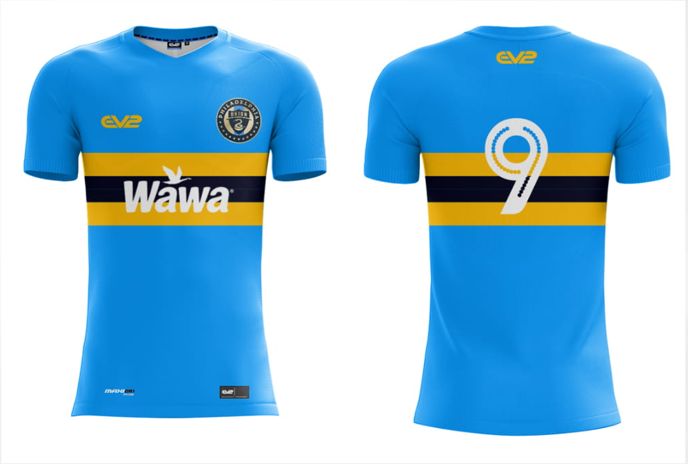 Horizontal stripes make color contrasts stand out and I decided to use light blue as the main color because that was the Union’s old away color. I think light blue is a beautiful color and should be used more on Union kits. The gold and dark blue are the main colors of the Union, which I prefer over a single-colored kit. The Wawa sponsorship is much more recognizable and synonymous with the city of Philly than Bimbo.