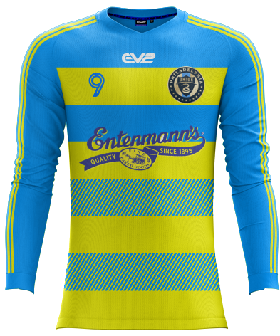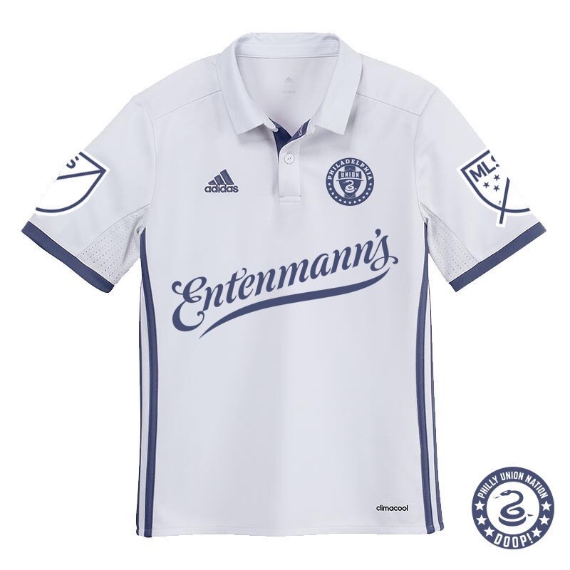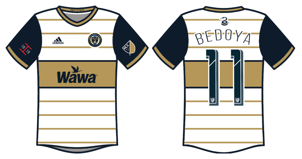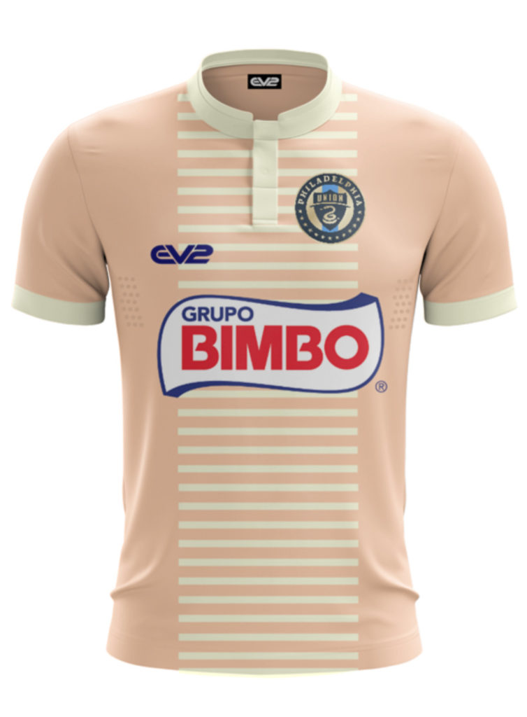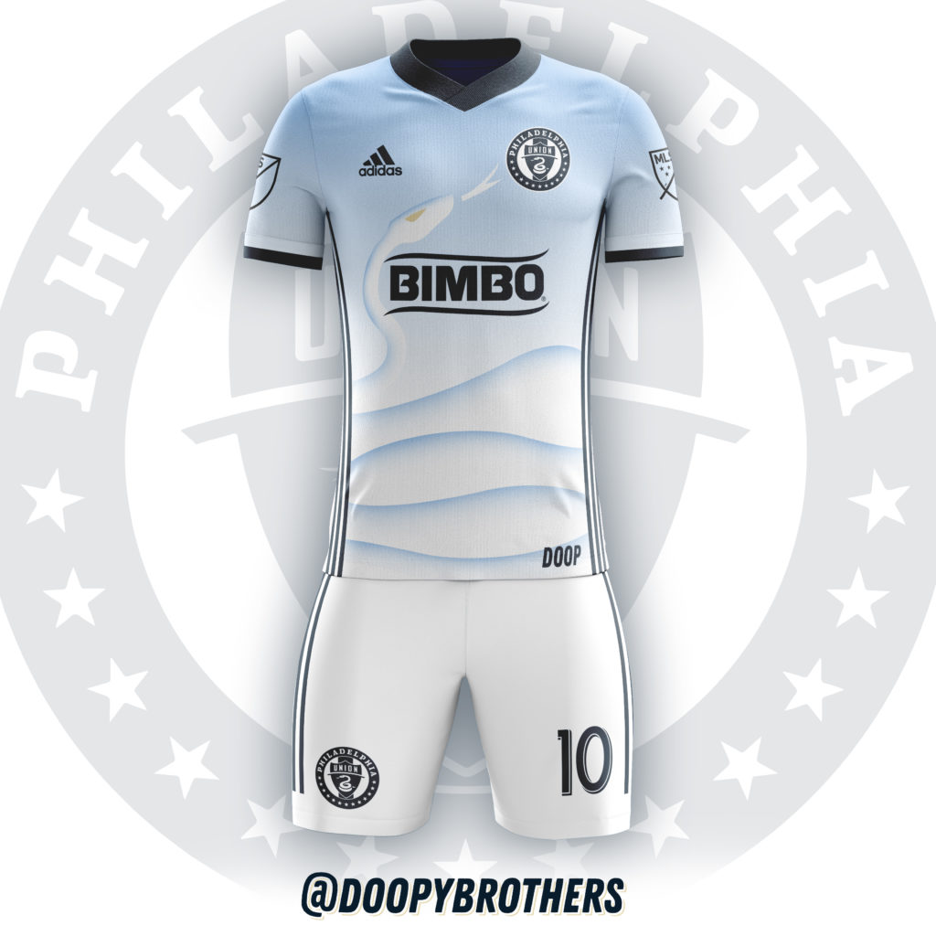 I went with the colors of the city of Philadelphia to celebrate the city and our 10th season as the city’s MLS team. I brought back the “stripe” down the front since it was part of our signature look before the Doop Hoops. Not a fan of the Bimbo logo, I went with one of the their regional brands that blends with the kit better and will not deter as many people from buying one.