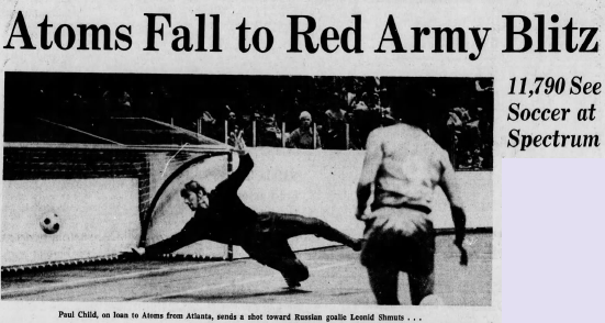 Miller knew exactly what he was up against, having had the misfortune of being the coach of a select squad that was trounced by the Red Army team in Toronto earlier in the tour. With the Atoms’ two top scorers and three-quarters of its starting defense playing in England at the time, Miller wisely “borrowed” four all-stars from the select squad: Paul Child and Alex Papadakis (both from the defunct Atlanta franchise), Dick Hall (Dallas), and Jorge Siega (New York). Among those filling out the Philadelphia roster were fellow indoor select members George O’Neill and Barry Barto, along with Bobby Smith, Bill Straub, and Sports Illustrated cover boy Bob Rigby.