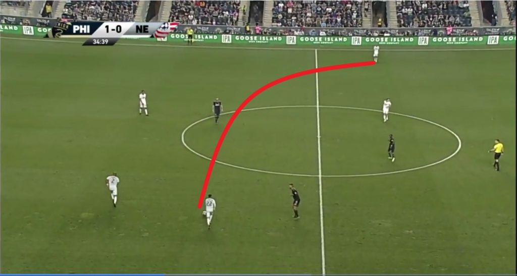 Santos is as much a winger as C.J. Sapong was when he was forced out wide, and like the former Union talisman, Santos inverted his position more often than not to allow Kai Wagner to overlap. Tucking in got Santos into the channels and on the back shoulder of his mark. That was enough to result in the Brazilian’s first goal, a flick from an inch-perfect cross off the German’s left back’s left foot (frankly the kind of aggressive and predictive cross rarely seen on this continent).