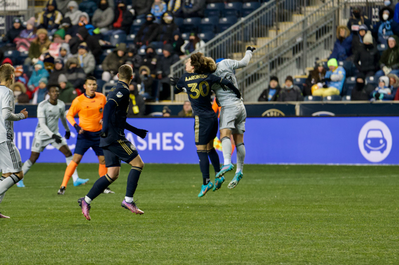 Aaronson competes for the header.