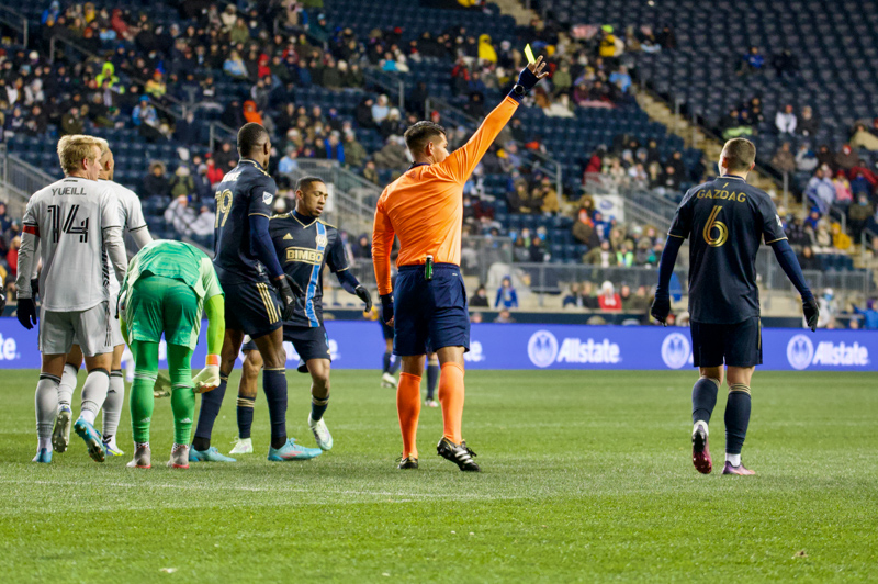 A yellow for Gazdag after he kicked the ball post-whistle.
