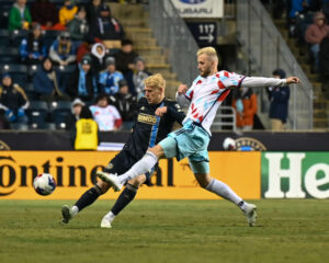 Not having the strongest night with getting balls in the net, Daniel Gazdag makes a pass setting up another campaign for a goal.