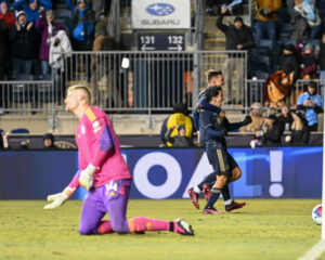Chris Brady and Carlos Terán celebrate Terán’s save at the net. Alejandro Bedoya lays on the ground after the Union were denied again.
