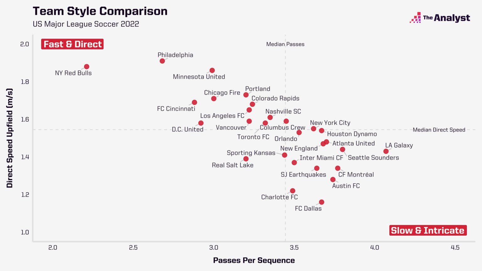 When analysing the teams at the end of last season, the Union were slightly quicker at progressing the ball upfield than the Red Bulls but also made more passes on average during that progression.