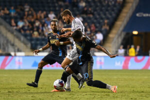 Daniel Gazdag tries to steal the ball from Christopher Durkin as he tries to work his way down the field in the first half.