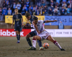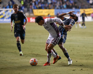 In his first game with the Union, Markus Anderson powers through the defending of Pablo Arboine.